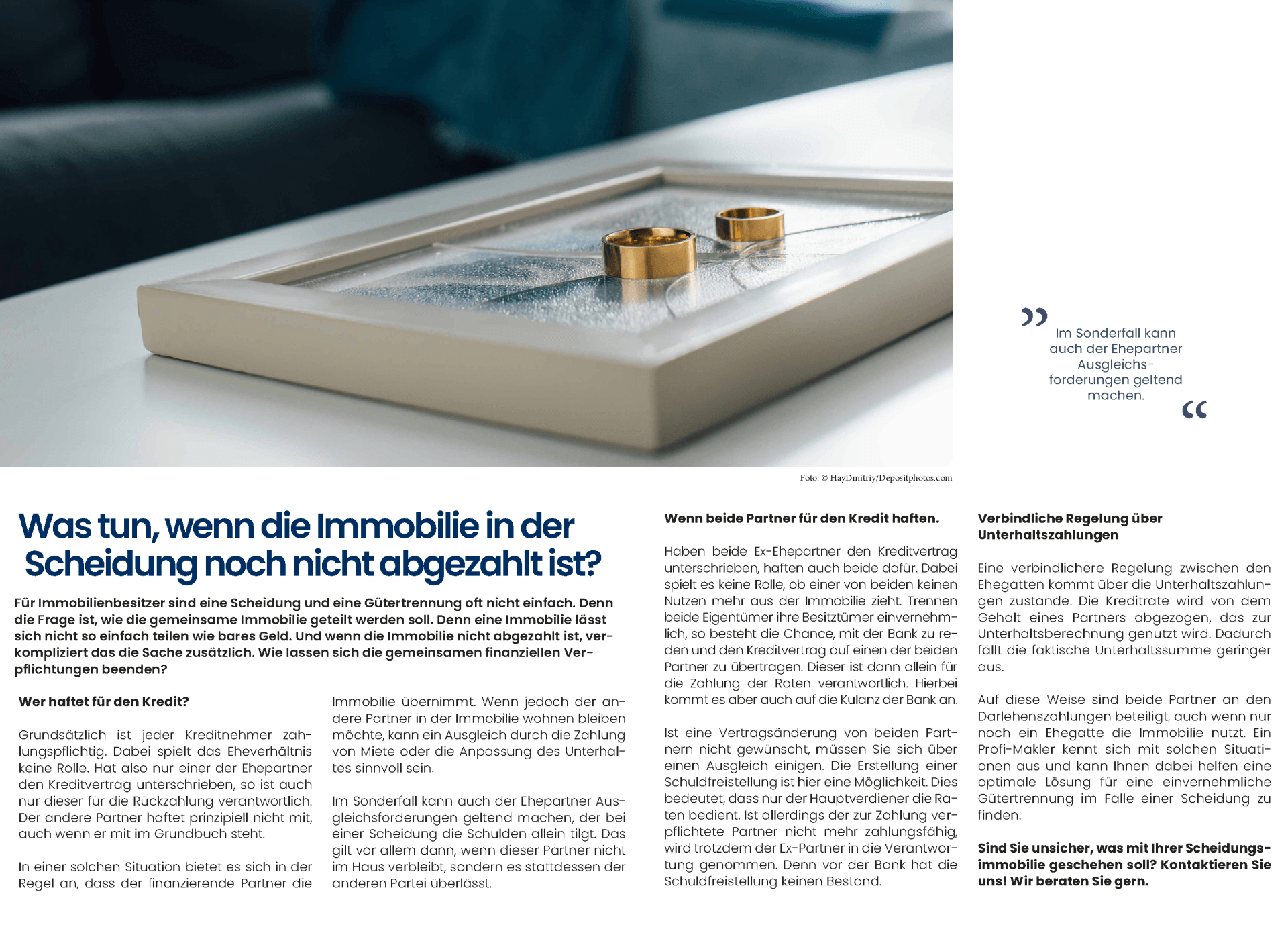 Um eine optimale Lösung für die gemeinsame Immobilie zu finden, sollten sich Scheidungspaare an einen Fachmann wenden. Lokale Qualitätsmakler sind mit dem Umgang mit Scheidungsimmobilien vertraut und beraten Scheidungspaare ganz unverbindlich. Sind Sie unsicher, wie es mit Ihrer Scheidungsimmobilie weitergehen soll? Dann kontaktieren Sie uns! Wir beraten Sie gern.